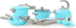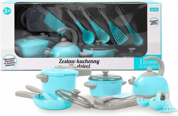 Dziecięcy zestaw kuchenny 11 szt. daje małym kucharzom wszystko, czego potrzebują do pierwszego „gotowania” w swojej wyobraźni. Zawiera garnek z pokrywką, patelnię, czajnik z gwizdkiem, przybory kuchenne oraz inne dodatki w nowoczesnej turkusowo‑szarej kolorystyce. Od 3 lat, bezpieczne i łatwe do mycia wykonanie z plastiku.