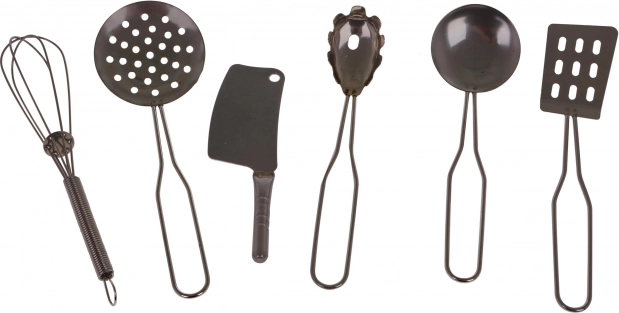 Zawiera różne naczynia kuchenne, w tym garnki ze stali nierdzewnej, patelnie i miski do realistycznej zabawy.