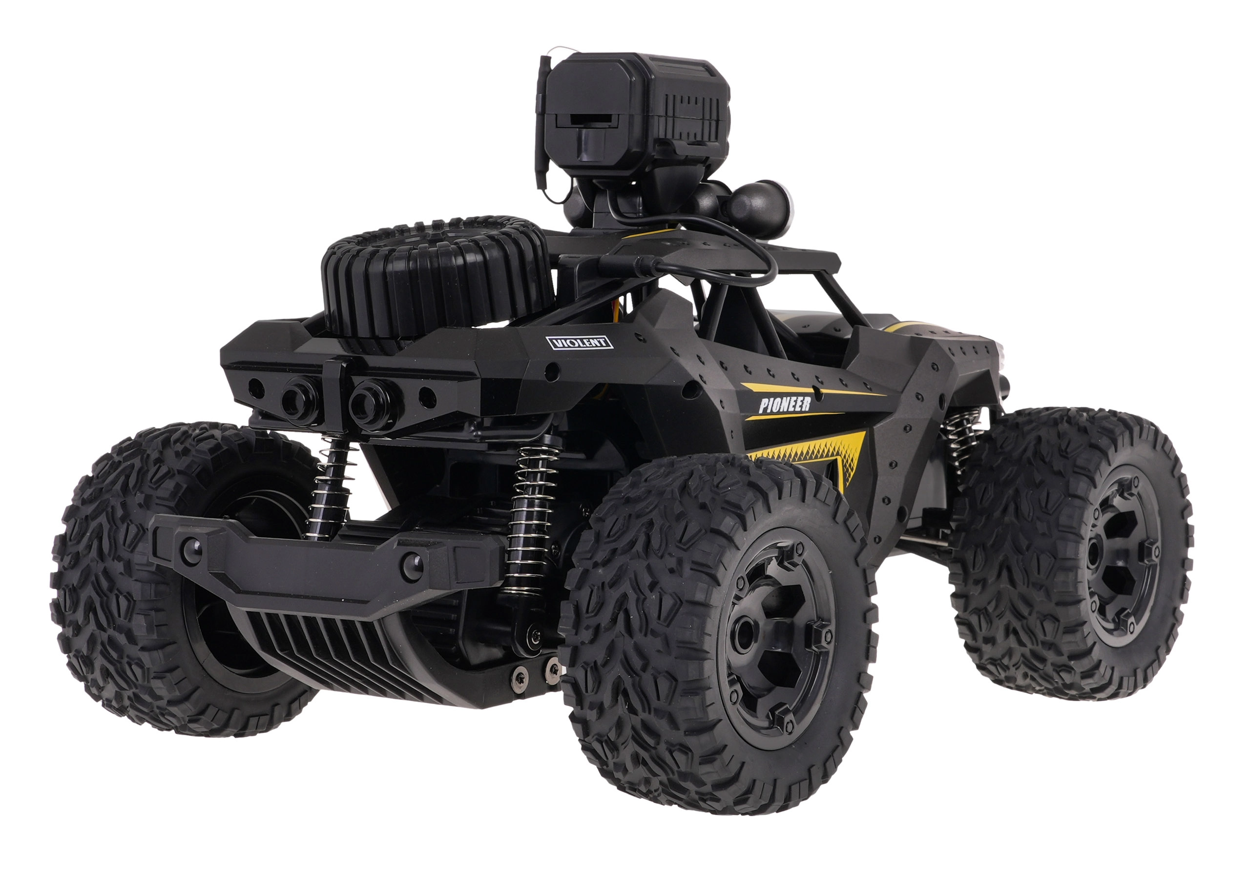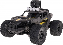 Terenowy pojazd RC PIONEER z kamerą stworzony jest do przygód. Wysoki prześwit, duże gumowe opony z agresywnym bieżnikiem oraz skuteczne amortyzatory zapewniają świetną trakcję i stabilność na żwirze, trawie czy ziemi. Metalowa karoseria i antykolizyjna rama chronią auto przy uderzeniach i upadkach.