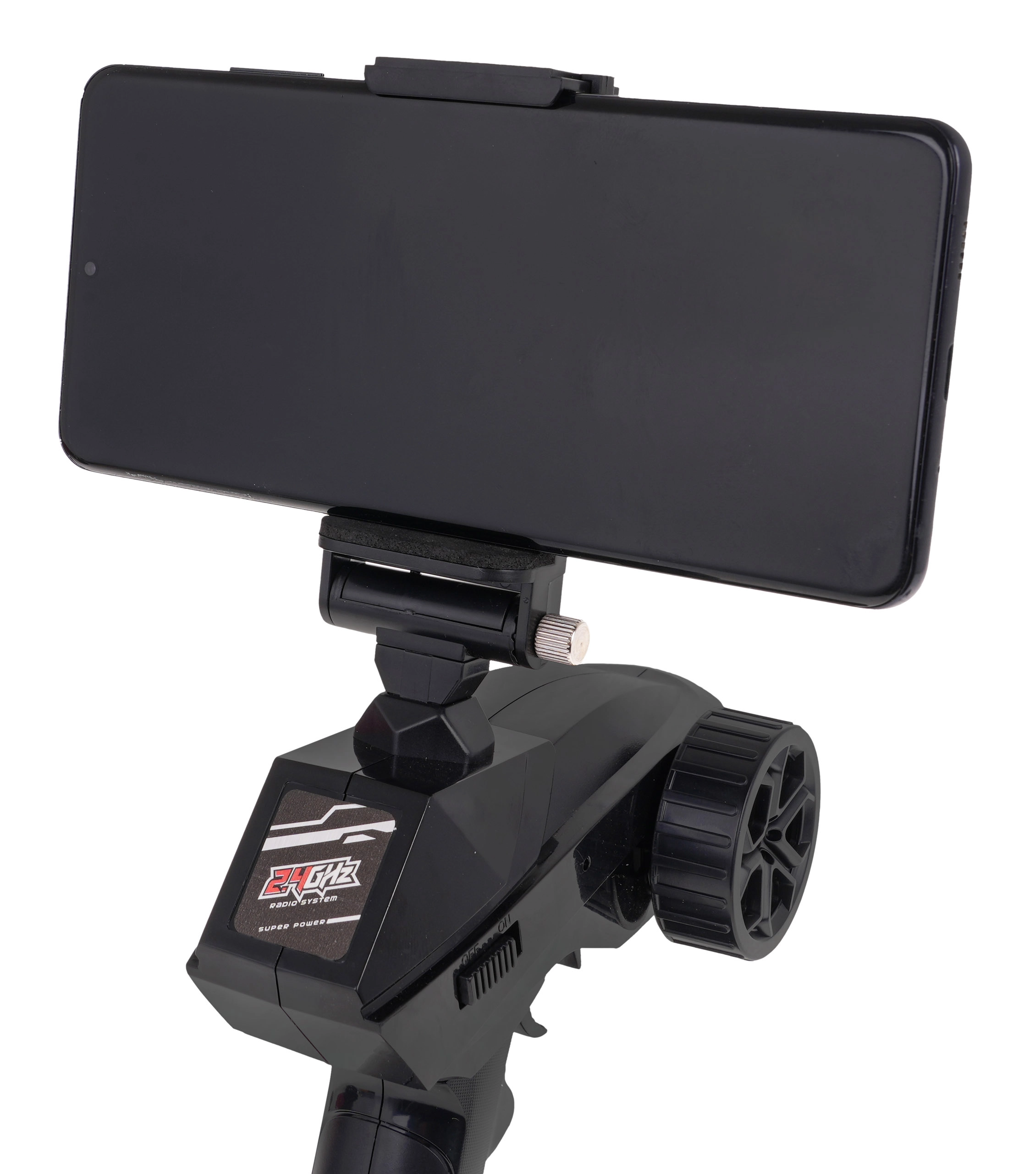 Ergonomiczny pistoletowy kontroler z precyzyjnym sterowaniem i trymerem działa na 2,4 GHz bez zakłóceń. Zintegrowany uchwyt na telefon ułatwia podgląd obrazu z kamery.