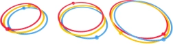 Gra zawiera kolorowe kółka w barwach czerwonej, niebieskiej i żółtej, które są atrakcyjne dla dzieci.