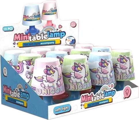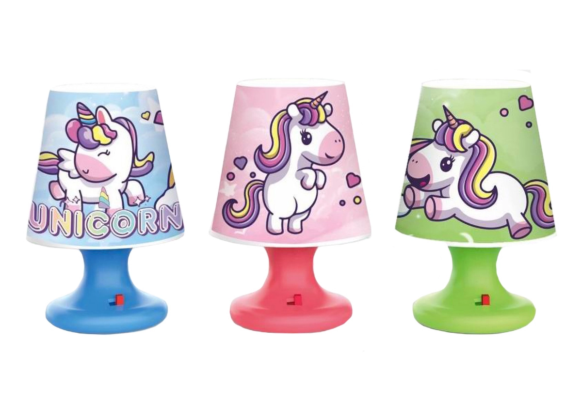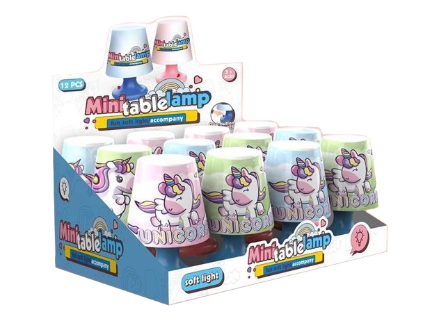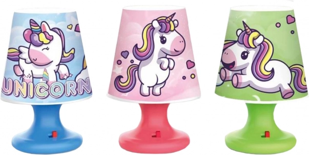 Mini nocna lampka w kształcie jednorożca. Wymiary 7,2 × 10,9 cm, 3× bateria AG13 w zestawie, trzy kolory: niebieski, różowy, zielony.