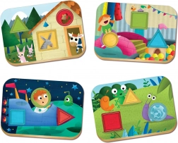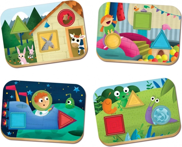 Ta zabawka wspiera dziecięcą koncentrację, rozwija wyobraźnię i uczy rozpoznawania podstawowych kształtów geometrycznych i kolorów w różnych środowiskach: na farmie, w pokoju zabaw, na łące i w kosmosie.