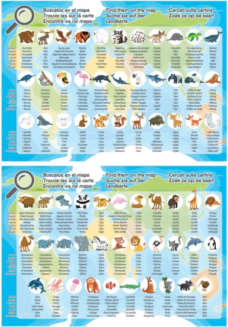Geograficzne puzzle dla dzieci z ilustracjami zwierząt świata. Na puzzlach znajdziesz pingwiny, wielbłądy czy na przykład bizona. Nazwy kontynentów i oceanów są w języku angielskim. W zestawie znajduje się również ulotka informacyjna z nazwami wszystkich zwierząt (po hiszpańsku, francusku, portugalsku, angielsku, niemiecku, włosku i niderlandzku). Gdy ułożysz puzzle, możesz pobawić się w wyszukiwanie obrazków. Kto znajdzie wszystkie? Wymiary ułożonych puzzli ok. 48 × 34 cm