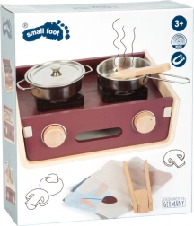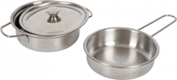 W zestawie znajduje się wszystko, co potrzebne do małej kulinarnej wyprawy: patelnia, garnek z pokrywką, szczypce do grilla, drewniana łopatka, ściereczka kuchenna oraz 2 kartonowe arkusze z produktami/ składnikami. Dzięki kompaktowym wymiarom i linowemu uchwytowi idealnie sprawdzi się w podróży, w pokoju dziecięcym i w ogrodzie.