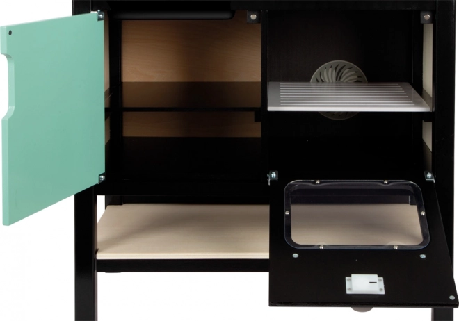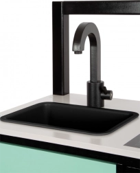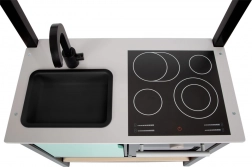 Dla maksymalnej frajdy z zabawy nie zabrakło kranu z dźwignią do regulacji „temperatury”, wyjmowanego plastikowego zlewu do „mycia naczyń” ani piekarnika z wyjmowaną blachą. Dno półki można wykorzystać jako ruszt do grillowania. Szafka pod blatem oraz haczyki na akcesoria pomagają utrzymać porządek, a lewą część szafki można łatwo zamienić w „lodówkę” lub „zmywarkę”.