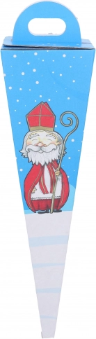 Niebieski róg z motywem Mikołaja, długość 50 cm. Idealny na mikołajkową paczkę, słodycze i drobne upominki. Stylowe i praktyczne sezonowe opakowanie.