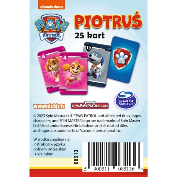 Gra karciana Piotruś z motywem PSI PATROL od marki Trefl to szybka i zabawna gra dla dzieci od 4 lat. Proste zasady, ulubieni bohaterowie oraz rozwój uwagi i koncentracji sprawiają, że to świetny wybór na rodzinne chwile i podróże.