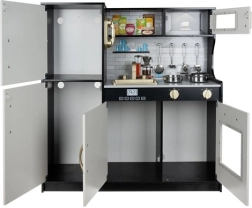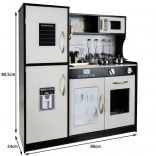 Dziecięca kuchnia XL z wysokiej jakości drewna (MDF) zachwyca dopracowaniem detali i trwałością. Lampkę LED można umieścić pod szafką, w szafce lub w piekarniku, dzięki czemu dzieci poczują klimat prawdziwego gotowania nawet przy półmroku. Obrotowe pokrętła kuchenki wydają realistyczne „klikanie”, co jeszcze bardziej wciąga do zabawy.