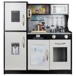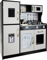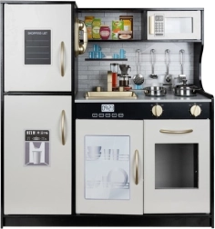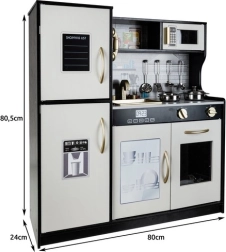 Stylowa drewniana kuchnia XL od KRUZZEL w połączeniu czerni, bieli i złota zapewnia dzieciom realistyczną zabawę w gotowanie. Oferuje podświetlenie LED, efekty dźwiękowe palników, elementy ruchome oraz bogate akcesoria gratis (garnek, patelnia, pokrywka, 4 łyżki). Wyjmowany zlew, piekarnik, mikrofalówka i schowki na „klik” wspierają kreatywność, naukę przez zabawę i odgrywanie ról.