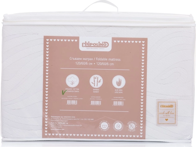 Składany materac CHIPOLINO o wymiarach 120 × 60 cm łączy naturalny komfort i praktyczność. Poszewka z BIO/organicznej bawełny jest delikatna dla skóry, bez pestycydów i szkodliwych chemikaliów, dzięki czemu nadaje się także dla wrażliwych dzieci i alergików. Rdzeń z wysokiej jakości pianki poliestrowej zapewnia zrównoważone podparcie kręgosłupa i długą żywotność.