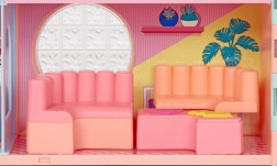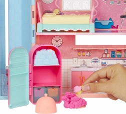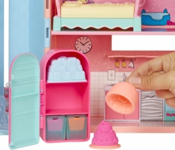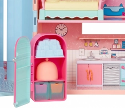 Domek jest utrzymany w pastelowych odcieniach i zawiera różne pokoje i akcesoria do wspaniałej zabawy.