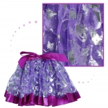 Fioletowa spódniczka z błyszczącymi srebrnymi wzorami i elastycznym pasem łatwo dopasowuje się do różnych sylwetek.