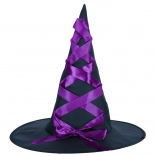 Czarno‑fioletowy kapelusz z charakterystyczną skrzyżowaną fioletową wstążką dodaje kostiumowi autentyczności.