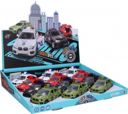 Dostępne są 4 wersje wzornicze – straż pożarna, wojskowy, policja SWAT oraz białe auto policyjne – idealne do kolekcji i na prezent. Model ma kompaktowe wymiary 13 × 6 × 6 cm i dzięki napędowi ciernemu łatwo rusza do przodu po rozpędzeniu.