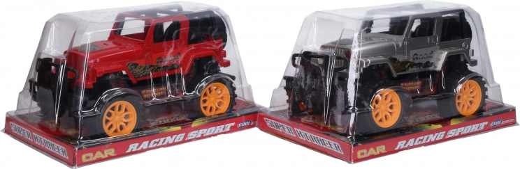 Samochód terenowy 20 cm na napęd cierny. Wytrzymałe wykonanie, dwa kolory – srebrny i czerwony. Świetna zabawa bez baterii dla małych rajdowców.