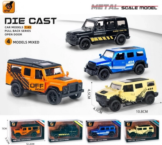 Metalowy samochód terenowy z funkcją napędu typu pull-back zapewnia zabawę dla małych miłośników aut. Elegancki design oraz otwierane przednie drzwi czynią go świetnym wyborem do każdej dziecięcej kolekcji.