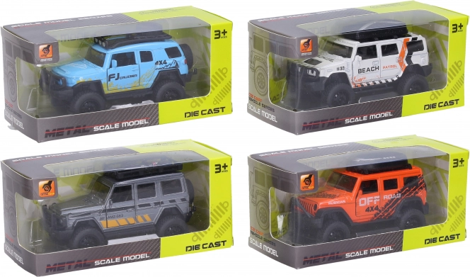 Solidny terenowy metalowy samochodzik z napędem wstecznym i otwieranymi drzwiami w 4 kolorach do zabawy i kolekcjonowania.