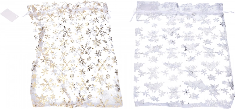 Elegancka świąteczna torebka z organzy z motywem płatków śniegu, idealna do pakowania prezentów. Dostępna w kolorach złotym i srebrnym.
