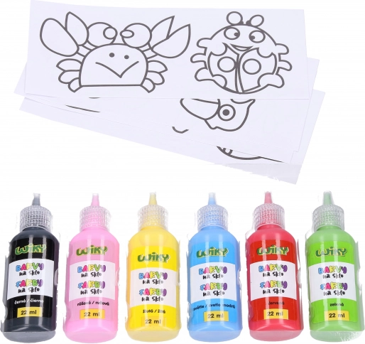 Zestaw farb do szkła z brokatem do kreatywnego malowania. Zawiera pięć kolorów i czarną konturę do delikatnych detali.