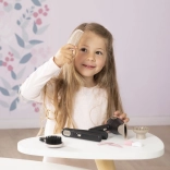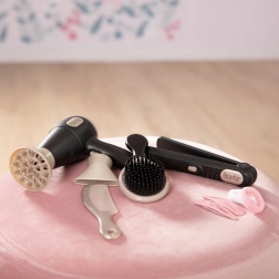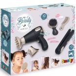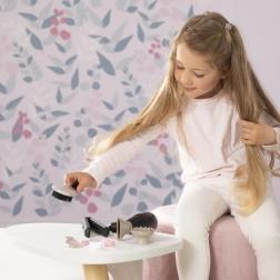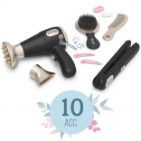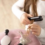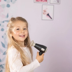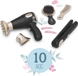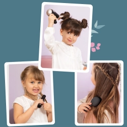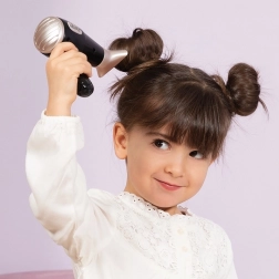 - Wiele zabawnych możliwości – jest tu wszystko, czego potrzebuje początkujący fryzjer: suszarka, wymienne nasadki do suszarki, prostownica, szczotka, grzebień, spinki i gumki do włosów.