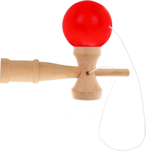 Kendama, tradycyjna japońska drewniana zabawka z czerwoną kulą do rozwijania koordynacji, zręczności i relaksu.