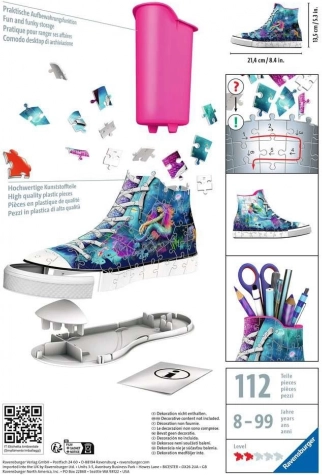 Odkryj zabawne i praktyczne 3D puzzle, które po złożeniu tworzą stylową tenisówkę z motywem Czarodziejskiej morskiej syreny. Zestaw zawiera solidne plastikowe elementy, które idealnie do siebie pasują bez klejenia, a efekt końcowy możesz wykorzystać jako oryginalny pojemnik na przybory do pisania na długopisy, kredki czy pędzle. Idealny prezent dla miłośników puzzli i designerskich dodatków do pokoju.