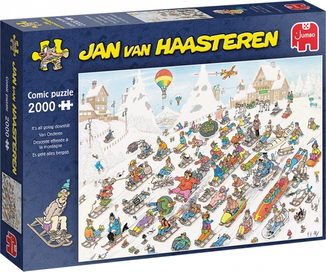 Puzzle JUMBO Jan van Haasteren – Z górki, 2000 elementów. Kolorowa, zabawna ilustracja pełna detali. Duży rozmiar 98 × 68 cm, świetna zabawa dla miłośników wyzwań.