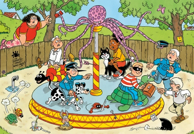Odkryj świat figlarnych ilustracji Jana van Haasterena w dziecięcej edycji Junior. Ta wesoła scena z otoczenia karuzeli obfituje w drobne żarty i typowe motywy autora – od płetwy rekina po niespodziewane postacie w tłumie. Dzięki większym i wygodnym do chwytania elementom układanie jest przystępne także dla młodszych dzieci.