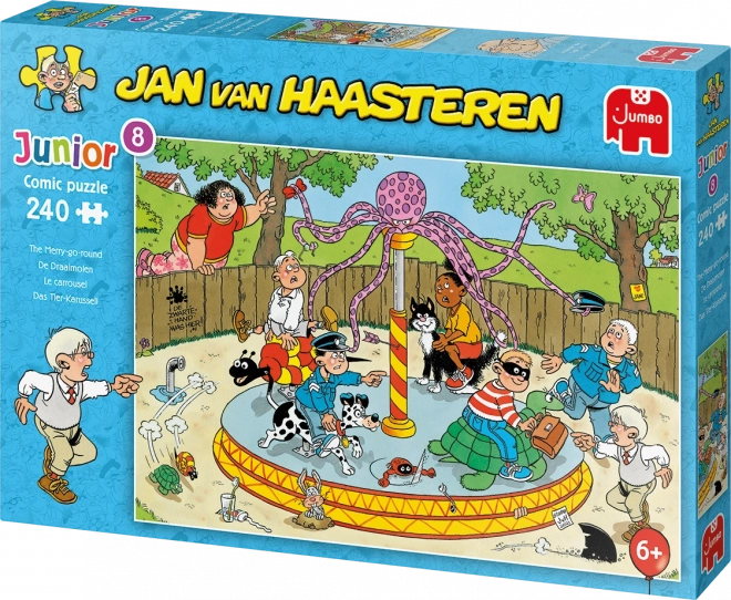 Puzzle JUMBO Jan van Haasteren Junior: Karuzela, 240 elementów. Wesoła scena pełna detali, wymiary 49 × 34 cm. Świetna rodzinna zabawa i trening koncentracji.
