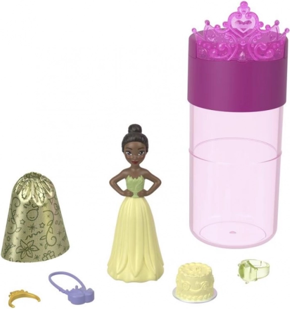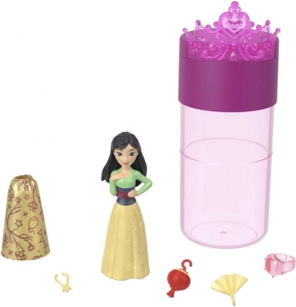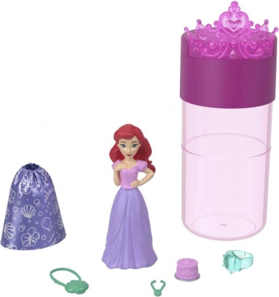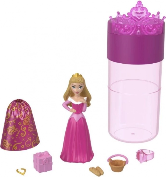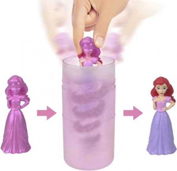 Zacznij od rozpakowania tuby, w której znajdziesz małą tajemniczą laleczkę (ok. 3,5"/9 cm) pokrytą warstwą Color Reveal oraz trzy saszetki z akcesoriami. Napełnij tubę wodą, zanurz laleczkę i delikatnie nią zakręć – w kilka chwil ukaże się jej charakterystyczny wygląd inspirowany ulubionymi filmami Disneya.