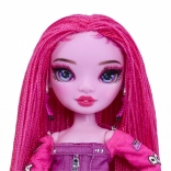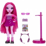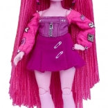 Lalka posiada żywo różowe, splecione włosy, wyraziste niebieskie oczy i szczegółowe elementy twarzy, które podkreślają jej stylowy wygląd.