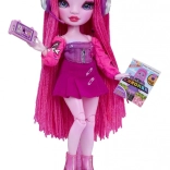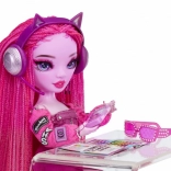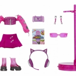 W zestawie z lalką znajdują się różne modowe dodatki, w tym różowe okulary przeciwsłoneczne, słuchawki z uszami i różowy stojak, które wspierają kreatywną zabawę i pozwalają tworzyć unikalne stylizacje.