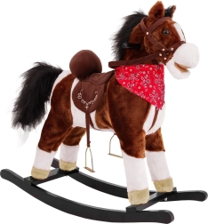 Uroczy bujany konik z miękkiego pluszu ucieszy każdego małego jeźdźca. Ma solidne drewniane płozy, wygodne siodło ze strzemionami i lejce. W uszach znajdują się czujniki dotykowe, które po dotknięciu uruchamiają realistyczne odgłosy rżenia i galopu, a konik porusza ogonem i pyszczkiem. Idealny do rozwijania równowagi i bezpiecznego bujania w pokoju dziecięcym.