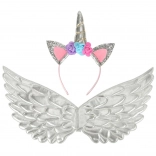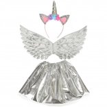 Ten wspaniały kostium pozwoli przemienić Twoje dziecko w niezwykłego jednorożca. Składa się ze srebrnej spódnicy, eleganckich skrzydeł oraz starannie wykonanej opaski z różyczkami. Idealny na każdą okazję, podczas której dziecko może cieszyć się bajkową zabawą.