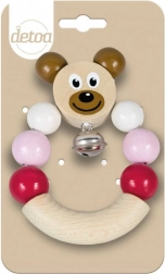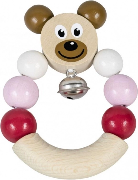 Drewniana grzechotka z misiem w różowym kolorze. Łatwa do chwytania, dzwoneczek delikatnie dźwięczy. Grzechotka jest lekka i odpowiednia dla dzieci od 6 miesięcy. W ekologicznym, naturalnym opakowaniu.