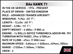 COBI Armed Forces BAe Hawk T1 to zestaw, który pozwala zbudować model samolotu służącego w Królewskich Siłach Powietrznych (RAF) od 1976 roku. Zestaw jest idealny dla wszystkich fanów modelarstwa lotniczego i techniki wojskowej. Model zaprojektowano w skali 1:48 i zawiera 362 elementy, które razem tworzą skrzydła o rozpiętości 19,5 cm. Model oferuje otwierany kokpit i demontowalne koła do efektownej ekspozycji na podstawce.
