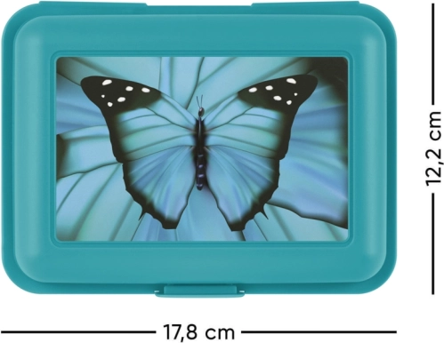 Plastikowe pudełko śniadaniowe Butterfly w kolorze niebieskim to idealne rozwiązanie do przenoszenia jedzenia. Dzięki motylemu wzorowi jest nie tylko praktyczne, ale także stylowe. Jest lekkie, łatwe w czyszczeniu i trwałe.