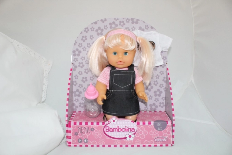 Lalka z blond kucykami umieszczona jest w atrakcyjnym różowym pudełku marki Bambolina – gotowa, by ucieszyć jako prezent.