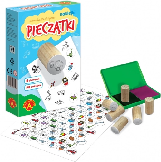 Kreatywny zestaw „Małe stemple i naklejki dla chłopców” marki Alexander to idealny wybór dla dzieci od 5 lat. Zawiera 6 stempli z ulubionymi motywami, czarny i fioletowy tusz oraz 78 kolorowych naklejek, które pozwalają na nieskończoną kreatywność.