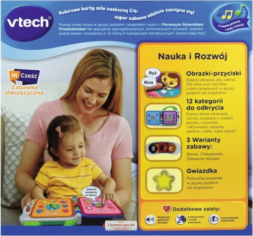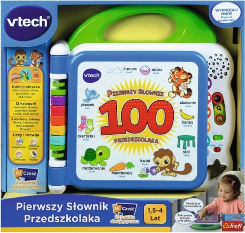 Pierwszy słownik przedszkolaka marki VTech to wyjątkowa edukacyjna zabawka dla dzieci ciekawych świata! Słownik uczy ponad 100 różnych słów w dwóch językach: polskim i angielskim. Zwierzątka: małpka, lewek i żółwik zapraszają do świata zabawy i nauki. Słownik zawiera 12 specjalnie zaprojektowanych laminowanych stron, które uczą słownictwa z różnych obszarów: zwierzęta domowe, zwierzęta dzikie, przeciwieństwa, jedzenie, ubrania, ciało, na zewnątrz, środki transportu, czynności i zabawy, kolory, jedzenie, owoce. Na każdej stronie znajdują się kolorowe obrazki, które po dotknięciu odtwarzają dźwięki.
