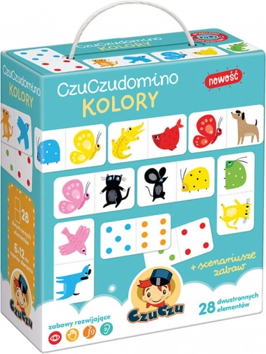 Odkryj sprytną grę i układankę w jednym! CzuCzu domino kolory oferuje 2 warianty gry oraz 28 dwustronnych elementów, które dzieci łączą według kolorów, zwierzątek lub liczby kropek. Świetnie rozwija spostrzegawczość, koncentrację i myślenie logiczne, a do tego rośnie razem z dziećmi.