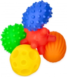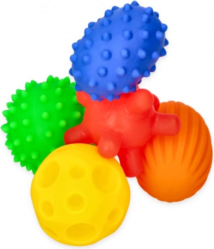 Zestaw 5 kolorowych piłeczek sensorycznych z wypustkami, kolcami i żłobieniami wspiera percepcję kształtów i faktur, koncentrację oraz naturalny rozwój zmysłów. Dzięki miękkiemu materiałowi piłeczki łatwo się chwyta drobnymi rączkami, nadają się do zabawy w domu, na macie i w wannie.