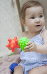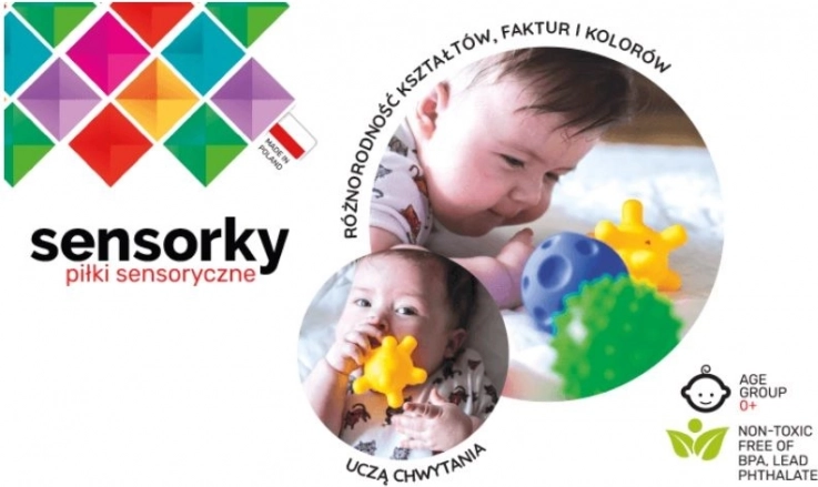 - Różne powierzchnie do stymulacji dotykowej, łatwe chwytanie, odpowiednie do turlania i ściskania