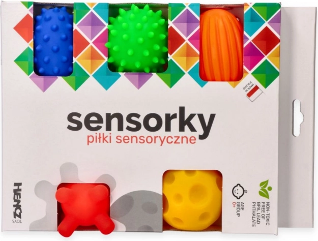 - 5 sensorycznych piłeczek o różnych teksturach i kształtach