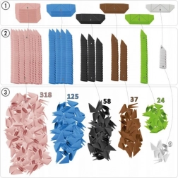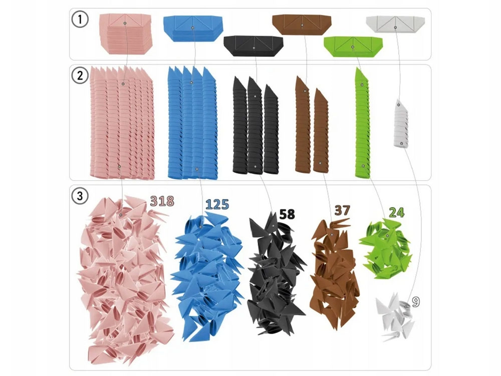 papierowe moduły, 2× papierowe nogi flaminga, 2× patyczki, 1× arkusz naklejek, 1× drukowana instrukcja