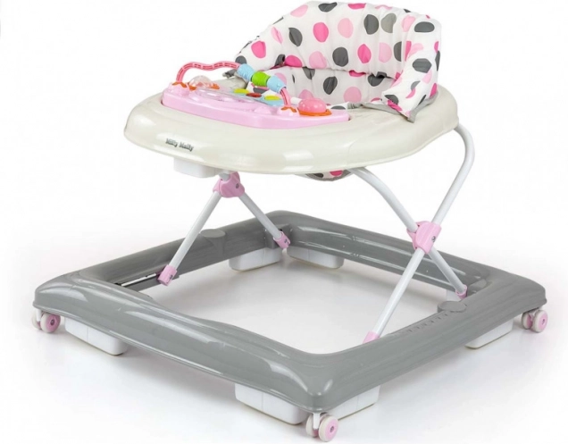 Cztery wysokiej jakości obrotowe kółka, które nie rysują nawierzchni, po której się poruszają, zapewniają swobodę ruchu, a osiem gumowych odbojników chroni dziecko przed zsunięciem się ze schodów lub innych przeszkód.