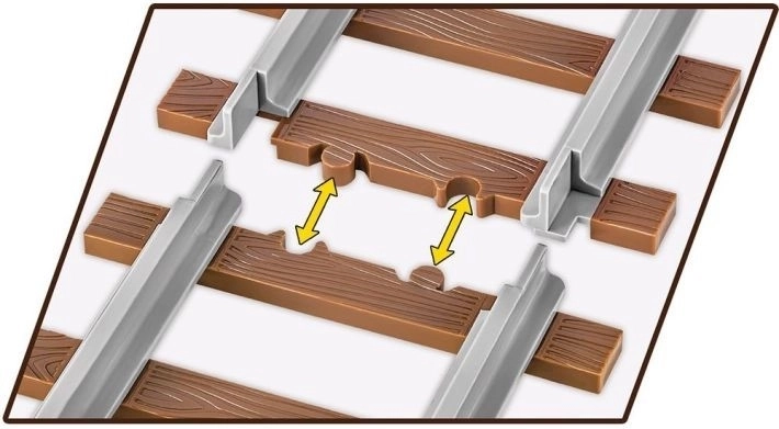 Częścią zestawu są dwie wymienne płytki z nazwą lokomotywy do wyboru: niemiecka BR 52 oraz polska Ty2. Firma COBI wyprodukowała także własny kształt klocka odwzorowujący odcinek toru. W zestawie dostępnych jest pięć takich odcinków o łącznej długości około 65 cm. Tory wykonano w nowoczesnej technologii dwukomponentowego wtrysku, co oznacza, że każdy pojedynczy odcinek o długości około 13 cm, będący jednym elementem – monolitem, powstaje z dwóch różnych kolorów tworzywa połączonych ze sobą. Szare stalowe szyny wyraźnie odcinają się od bardzo realistycznie odwzorowanych brązowych podkładów kolejowych. Na każdym podkładzie nie widać pinów, co zwiększa realizm, a każdy jest pokryty fakturą desek, czyli imitacją struktury drewna. Szyny można wczepić w płyty konstrukcyjne i mają otwór techniczny, dzięki czemu da się je na stałe przymocować do kolejowego dioramu, np. za pomocą śrubki lub gwoździka.