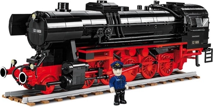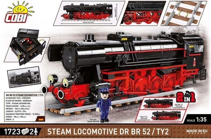 Zestaw z modelowym blokowym odwzorowaniem niemieckiej parowej lokomotywy DR BR 52 / TY2 z okresu II wojny światowej jest częścią całkowicie nowej kolekcji Pociągi w ofercie firmy COBI. Zestaw wiernie oddaje nadwozie, proporcje i detale legendarnej parowozu, który jest prawdopodobnie najpopularniejszy i najbardziej rozpoznawalny wśród wszystkich entuzjastów kolei na świecie. Specjalna edycja 2 w 1 zawiera dwie różne grupy dodatkowych klocków, które umożliwiają zbudowanie modelu niemieckiej lokomotywy DR BR 52 z niemieckim oznaczeniem z okresu II wojny światowej lub lokomotywy z polskim oznaczeniem Polskich Kolei Państwowych z powojennej Polskiej Rzeczypospolitej Ludowej. Oprócz różnych klocków z odmiennymi nadrukowanymi symbolami, numeracją i oznaczeniami, zestaw zawiera także przeprojektowane, większe lampy czołowe i końcowe dla polskiej wersji, wybrane klocki w innym wariancie kolorystycznym oraz dwie różne figurki: niemieckiego maszynisty z okresu II wojny światowej i polskiego maszynisty w powojennym mundurze PKP z charakterystycznym godłem państwowym – polskim orłem z królewską koroną usuniętą przez komunistów.