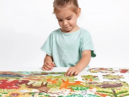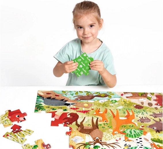 Opakowanie puzzli zawiera nie tylko same elementy, ale również plakat z przedstawieniem wszystkich zwierzątek. Taka interakcja wspiera kreatywną zabawę i inspiruje do kolejnych aktywności edukacyjnych związanych z przyrodą.